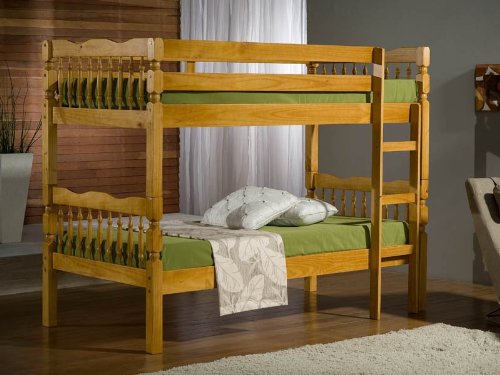 This is the Weston bunk bed from Birlea Furniture. This bed is full of detail and looks beautiful with it's honey pine finish, which allows it to sit well with almost any bedroom style. The honey pine coating also brings out the natural detailing of the wood, with the grain and knots visible and also gives the bunk a unique look. Attention to detail can be seen all over the Weston Bunk, with corners and bars carefully crafted to the highest quality and the curving design on the head and foot ends. Two long bars along the top bunk will ensure excellent safety.