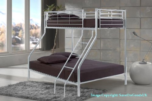 This "Trio Bunk" Bed has been created using robust metal and is cleverly designed to incorporate a single and double in your bedroom. The triple sleeper has a silver finish and contains a built-in ladder to the top bunk, whilst the metal rod base of each bed has been designed for strength and durability.