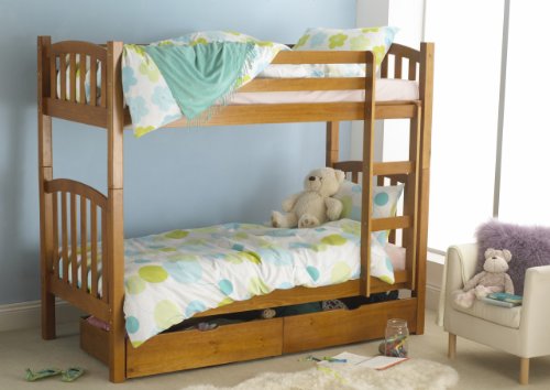 The Hyder Montreal bunk beds are high quality, solid pine bunks with a warm pine finish. Available with or without 2 large pine drawers. The Montreal have neat curves and flat spindles giving this solid pine bunk a modern design. The top quality solid pine and extra safe construction ensures strength and durability to these fine quality pine bunks.