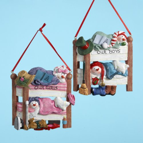 Boy and girl snowmen are snuggled tightly in their bunk beds which have space for personalizing with names